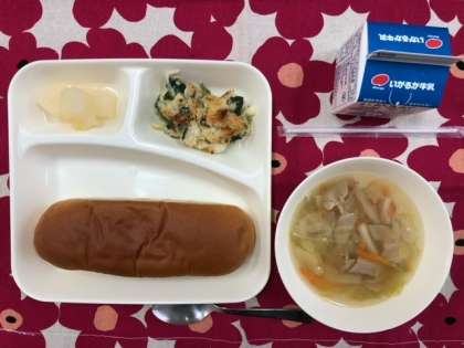 本日の献立は、ホタテ貝のグラタン、スープ、和なしの缶詰め、黒糖パン、牛乳です。
