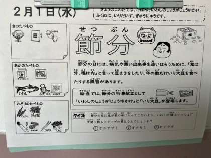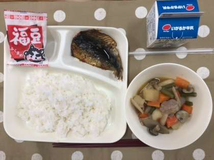 本日の献立は、いわしの生姜醤油かけ、含め煮、煎り大豆、ごはん、牛乳です。今日は「節分」の行事献立です。