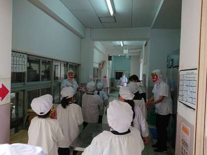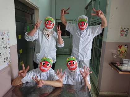 「節分」の行事献立にちなんで、今日は調理員さん全員が鬼の面をつけて、子どもたちに食缶の手渡しをしてくださいました。