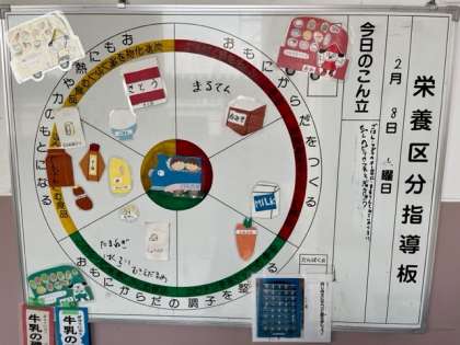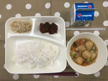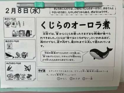 2月8日(水)の献立は、くじらのオーロラ煮、丸てんと野菜のうま煮、もやしのピリ辛和え、ごはん、牛乳でした。
