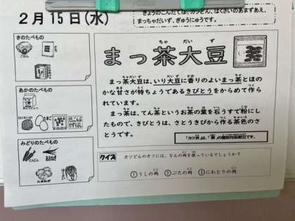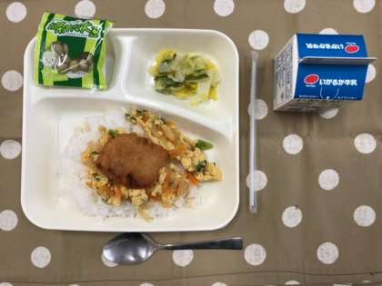 本日の献立は、かつ丼、白菜の甘酢和え、抹茶大豆、牛乳です。