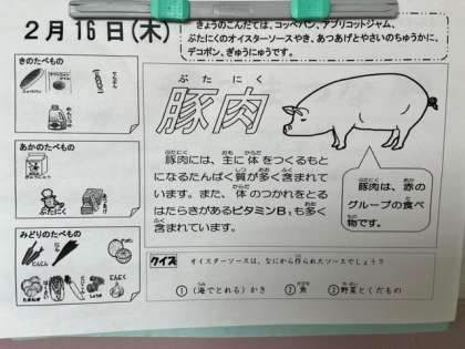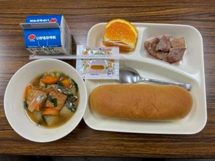 本日の献立は、豚肉のオイスターソース焼き、厚揚げと野菜の中華煮、コッペパン、アプリコットジャム、デコポン、牛乳です。