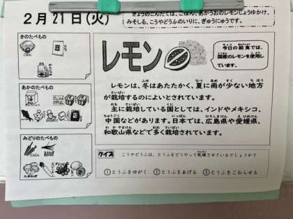 本日の献立は、赤魚のレモン醤油かけ、高野豆腐の炒り煮、みそ汁、ごはん、牛乳です。