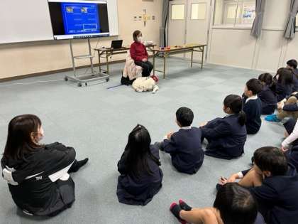 まず、2時間目には、3年1,2組そろって、多目的室で盲導犬について学びました。