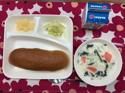 本日の献立は、ほうれん草のクリームシチュー、キャベツのサラダ、洋梨の缶詰め、黒糖パン、牛乳です。