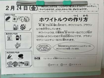 今日は洋食メニューです。寒い日に、温かいクリームシチューがとても美味しいです。