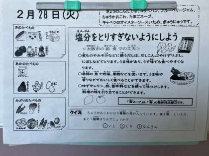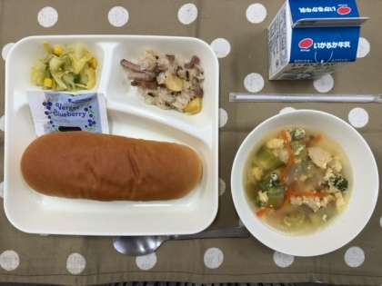 2月最終日の献立は、中華おこわ、キャベツのオイスターソース炒め、たまごスープ、コッペパン、ブルーベリージャム、牛乳です。