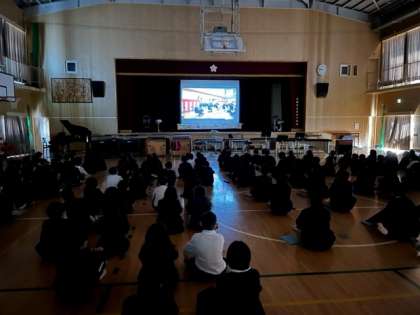 「6年生の入場」、「はじめのことば」、に続いて、在校生から卒業生への「お祝いの動画」を視聴しました。