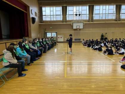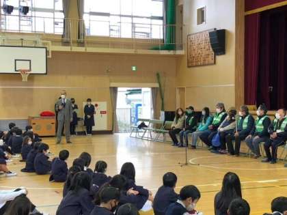 毎日の集団登校を見守ってくださっている「見守り隊さん」の皆様に、6年生代表児童よりお礼の言葉を述べました。
