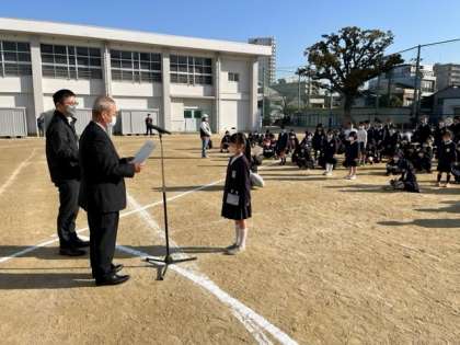 児童朝会において、西成区「こどもの読書活動推進事業」の「最多読書賞表彰状、記念品の贈呈」を、区長様にしていただきました。他の表彰対象者の皆さんには、のちほどお渡しします。