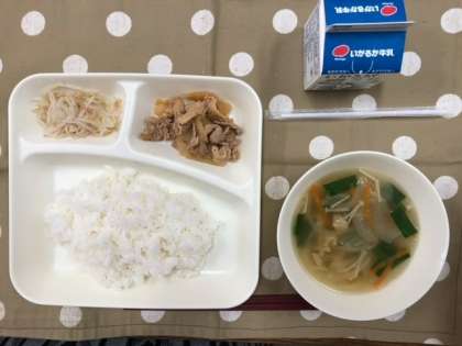 本日の献立は、豚肉のコチジャン炒め、鶏肉とはるさめのスープ、もやしのナムル、ごはん、牛乳です。