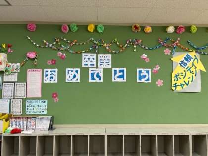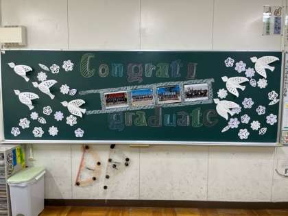 6年1組の教室と、図書室の、「ご卒業お祝い」の飾りつけです。