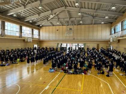 写真上は、「対面式」での、6年生代表から1年生へのメッセージ読みあげの様子です。