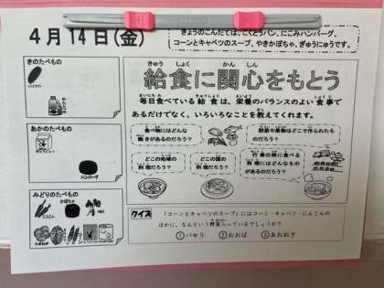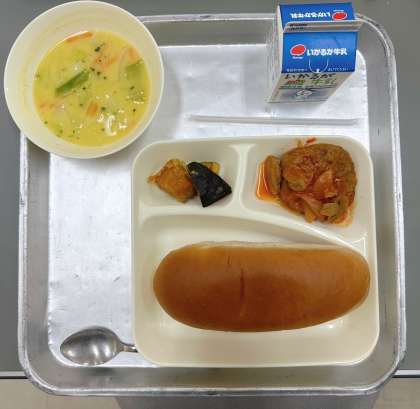 本日の献立は、煮込みハンバーグ、焼きカボチャ、コーンとキャベツのスープ、黒糖パン、牛乳です。