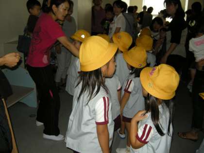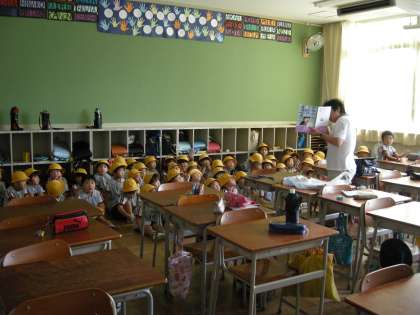 玉出幼稚園の園児たちは、玉出小学校に避難してきます。3階の教室を避難場所にし、そこから引き渡し訓練を行いました。