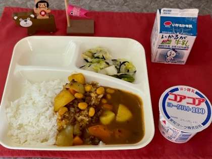 今日の献立は、牛肉と大豆のカレーライス、キャベツのヒジキドレッシング、ヨーグルト、牛乳です。
