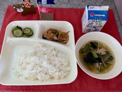 本日の献立は、ホイコーロー、中華スープ、きゅうりのピリ辛和え、ごはん、牛乳です。