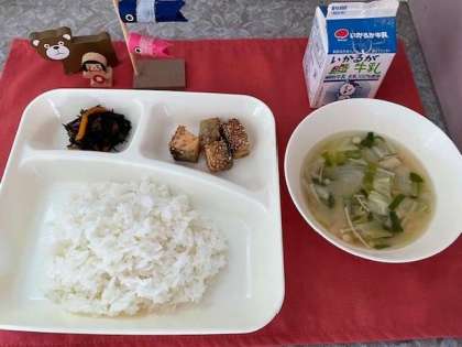 本日の献立は、鮭の胡麻みそ焼き、五目汁、ひじきの炒め煮、ごはん、牛乳です。