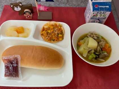 本日の献立は、豚肉と野菜のカレースープ煮、変わりピザ、コッペパン、いちごジャム、ミックスフルーツの缶詰め、牛乳です。