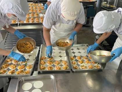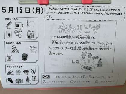 写真のように、変わりピザも、一つ一つが給食室での手作りです。調理員の皆様、ありがとうございます。