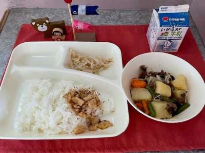 本日の献立は、肉じゃが、もやしの柚子の香和え、胡麻かか炒め、ごはん、牛乳です。