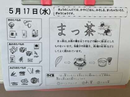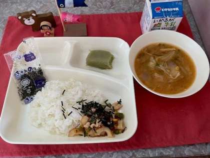 本日の献立は、かやくごはん、みそ汁、抹茶ういろう、牛乳です。
