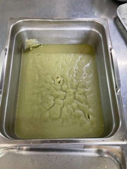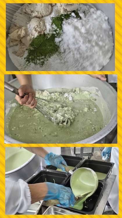 抹茶ういろうは、上新粉、抹茶、砂糖、白いんげんのペースト、水を混ぜ合わせ、焼き物機で蒸したものです。
