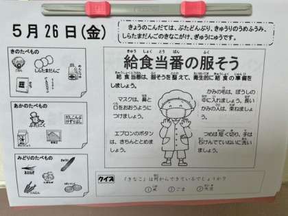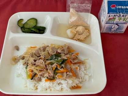 本日の献立は、豚どんぶり、きゅうりの梅風味、白玉団子のきなこがけ、牛乳です。
