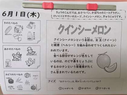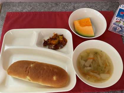本日の献立は、かぼちゃのミートグラタン、鶏肉と野菜のスープ、おさつパン、クインシーメロン、牛乳です。