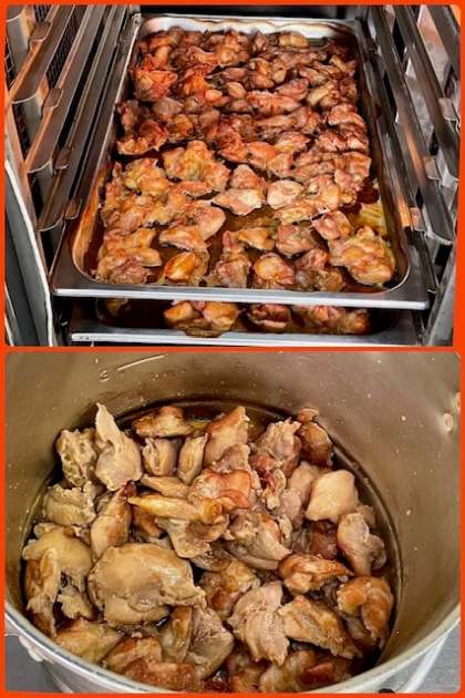 「鶏肉の醤油バター焼き」は、料理酒と濃い口醤油で下味をつけた鶏肉に、溶かしバターをかけて、焼き物機で焼いています。