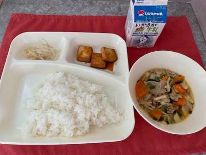 本日の献立は、中華煮、厚揚げのピリ辛醤油かけ、もやしの中華和え、ごはん、牛乳です。