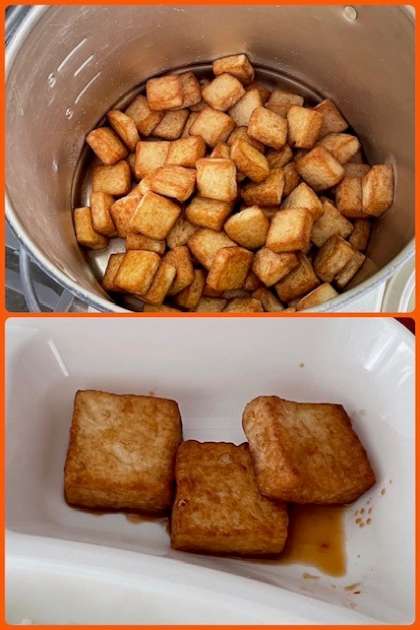 厚揚げのピリ辛醤油かけは、スチコンで蒸し焼きにした厚揚げに、砂糖、濃い口しょうゆ、豆板醤を合わせ煮たタレをかけています。