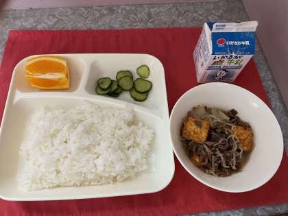 本日の献立は、すき焼き煮、きゅうりの生姜漬け、ごはん、牛乳、オレンジです。