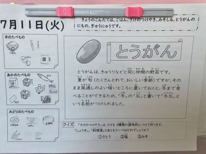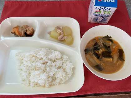 本日の献立は、鮭のつけ焼き、冬瓜の煮物、みそ汁、ごはん、牛乳です。