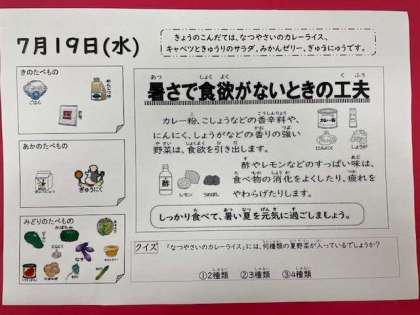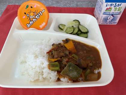 7月19日(水)の給食は、夏野菜のカレーライス、キャベツときゅうりのサラダ、みかんゼリー、牛乳でした。