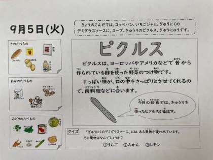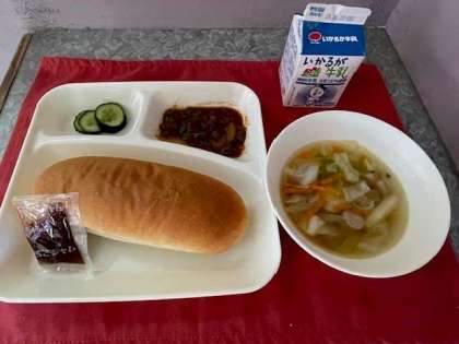 本日の献立は、牛肉のデミグラスソース煮、スープ、きゅうりのピクルス、コッペパン、いちごジャム、牛乳です。