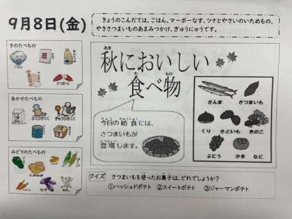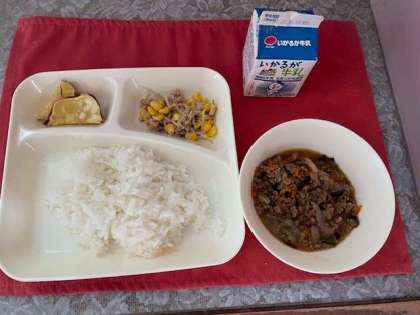 本日の献立は、マーボー茄子、ツナと野菜の炒め物、焼きさつまいもの甘蜜かけ、ごはん、牛乳です。