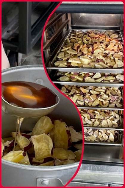 今日の「焼きさつまいもの甘蜜かけ」は、旬のさつまいもを焼き物機で蒸し焼きにし、砂糖、塩、濃い口しょうゆ、湯を合わせて煮た蜜をかけています。
