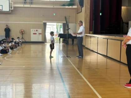 今日は、賞状の伝達、そして、9月の「緑いっぱいチャレンジ」の「9月がんばったで賞」の伝達を行います。