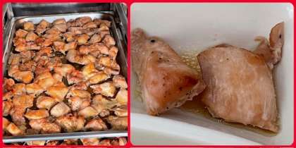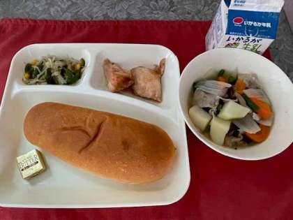 本日の献立は、鶏肉のガーリック焼き、スープ煮、野菜のソテー、コッペパン、バター、牛乳です。