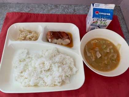 本日の献立は、赤魚の醤油だれかけ、豚汁、もやしの柚子の香あえ、ごはん、牛乳です。