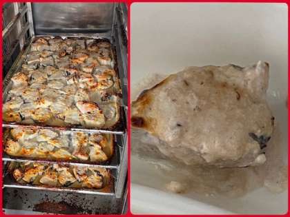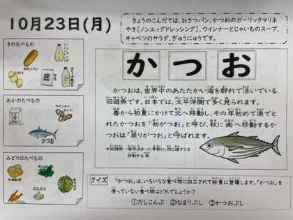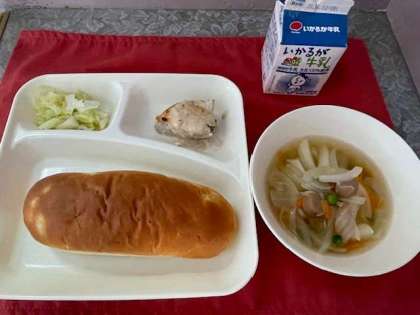 本日の献立は、かつおのガーリックマリネ焼き(ノンエッグドレッシング)、ウインナーとじゃがいものスープ、キャベツのサラダ、おさつパン、牛乳です。
