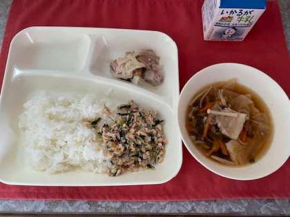 本日の献立は、鶏肉の柚子塩焼き、ソーキ汁、ツナ大豆そぼろ、ごはん、牛乳です。