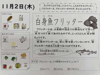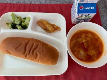 本日の献立は、白身魚のフリッター、ミネストローネ、ブロッコリーのサラダ、黒糖パン、牛乳です。