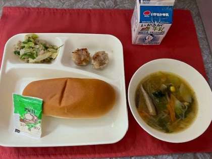 本日の献立は、焼きシュウマイ、ツナと野菜のオイスターソース炒め、中華味噌スープ、コッペパン、ソフトマーガリン、牛乳です。