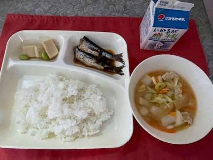 本日の献立は、いわしの生姜煮、高野豆腐の煮物、みそ汁、ごはん、牛乳です。
