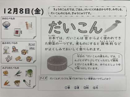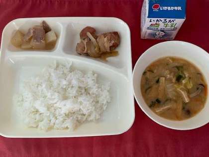 本日の献立は、鶏肉の甘辛焼き、みそ汁、大根の煮物、ごはん、牛乳です。
