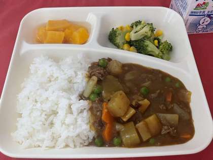 本日の献立は、冬野菜のカレーライス、ブロッコリーとコーンのサラダ、黄桃の缶詰め、牛乳です。