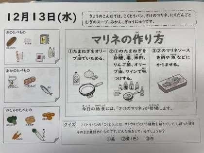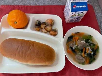 本日の献立は、鮭のマリネ、肉団子と麦のスープ、黒糖パン、みかん、牛乳です。