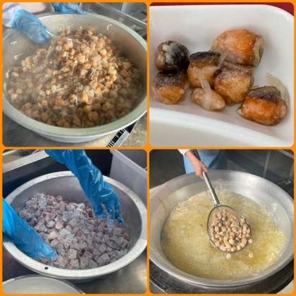 「鮭のマリネ」は、塩、コショー(白)で下味をつけ、でん粉をまぶして菜種油で揚げた鮭に、玉ねぎの入ったマリネ液を絡ませています。